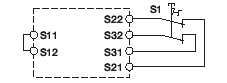 如果是雙通道不檢測(cè)觸點(diǎn)間短路故障工作方式的話則是短接S21和S22,兩個(gè)常閉觸點(diǎn)分別置于S11和S12,S11和S32之間。